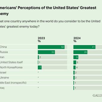 去年11月盖洛普宣布撤出中国,关闭3个办事处。2月1日至20日,盖洛普针对美国人认为“哪个国家是美国最大敌人”进行民意调查,结果显示,中国、俄罗斯与伊朗分居前3名。不过,相比一年前,中国、俄罗斯分别下降了9%和6%。在好感度方面,在列出的21个国家中,中国也不是好感度最低的国家,有20%的受访者对中国有好感,但同时也有77%对中国没有好感。好感度最低的国家是俄罗斯(8%),其次是朝鲜(9%)。调查指出,对中俄的好感度近2年来变化不大。去年盖洛普类似的调查中,将中国视为头号敌人的美国人占50%,对中国持好感的受访者仅为15%。